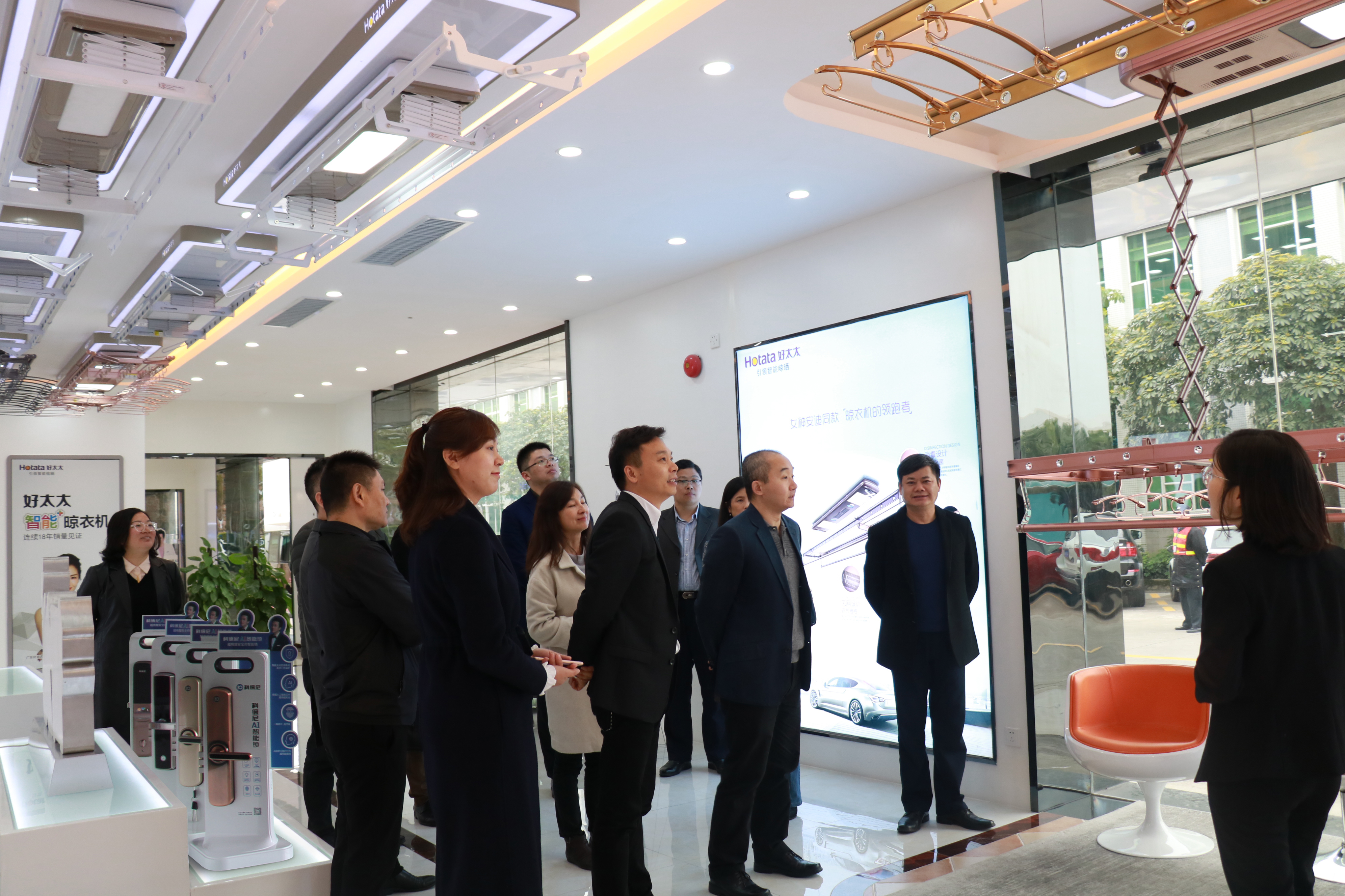 會議結束后,調研組參觀了廣東好太太集團品牌展示中心,參觀過程中,由廣東好太太集團董事長沈漢標圍繞公司的核心技術產品作現場介紹講解。隨著物聯網、云計算產業的蓬勃發展,以智能鎖、智能晾衣機為代表品類的智能家居已成為物聯網領域備受矚目的應用。廣東好太太集團正著力打造智慧家庭生態圈,以智能鎖、智能晾衣機為拳頭產品,打造智能安防、智能晾曬、智能清潔、智能交互四大板塊,實現家居生活場景全覆蓋。