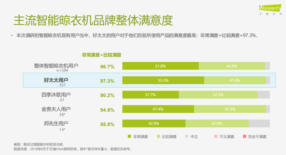 報告數據公開可知,好太太的品牌認知度更是達到78.6%,且調研的已購買和正在使用智能晾衣機的消費者當中,近6成購買過好太太的智能晾衣機,他們對目前所使用產品的滿意度最高達到 97.3%。數據背后體現的是,所有品牌晾曬市場都不及好太太一家的體量大,好太太在業內占不僅是“大牌子”,而是“超級大牌”。
