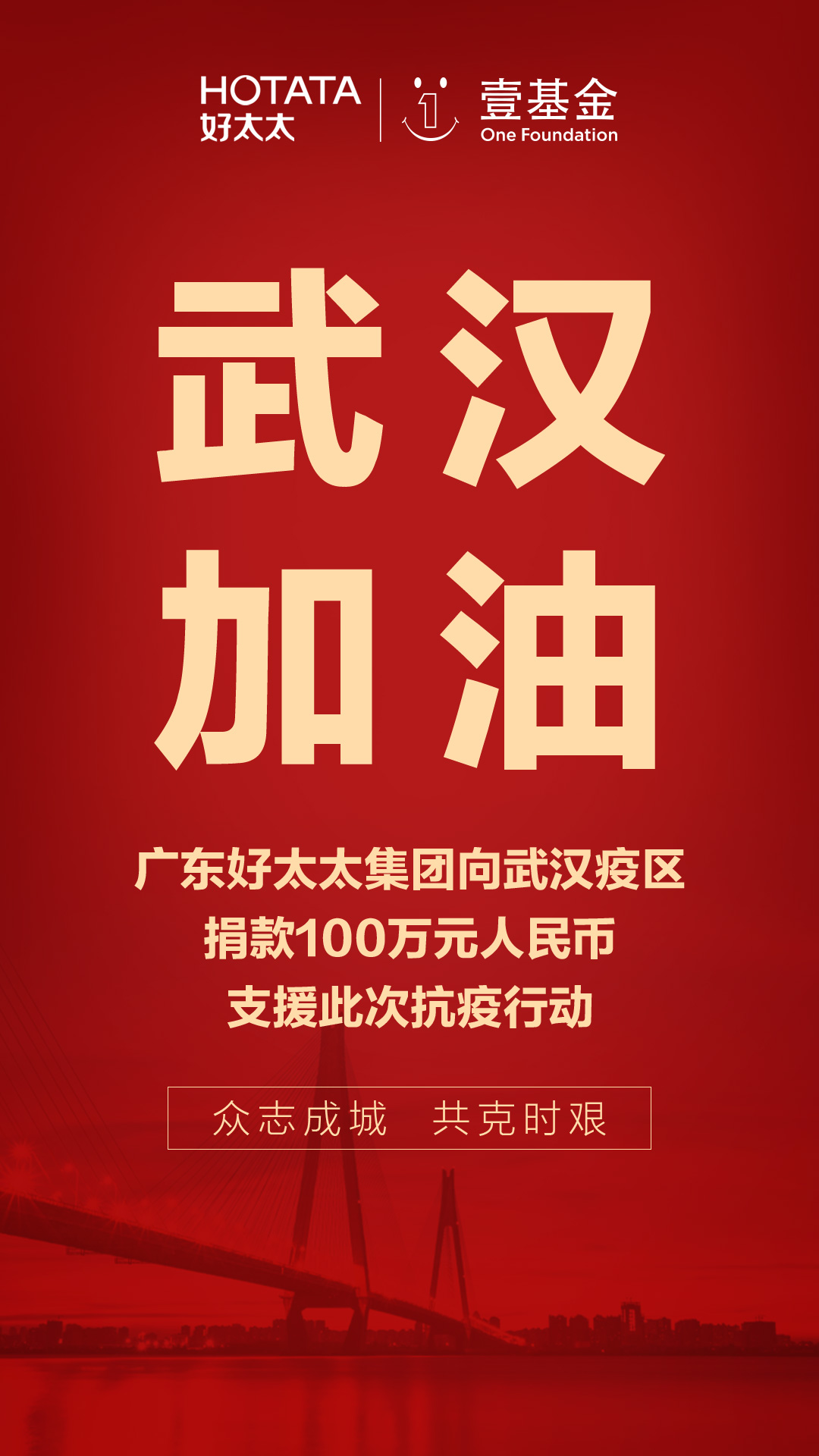 好太太集團攜手壹基金馳援武漢捐款100萬用于抗疫行動,援助湖北抗擊新型冠狀病毒,百萬抗疫物資即將發往疫區,愿疫情早日結束。
