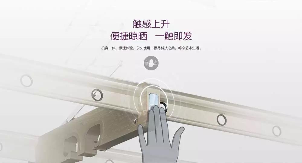突破傳統的按鍵控制,手指輕輕一觸,即可實現上升功能,在行業首次應用V-LED顯示,實時顯示晾曬狀態,將智慧化的晾曬體驗發揮到極致。