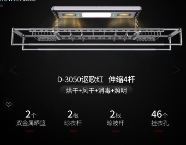 這款晾衣架的優點有很多,比較有特色的就是衣被同晾功能,·其次就是伸縮晾桿,承重能力比較大,并且帶有3D廣角照明!