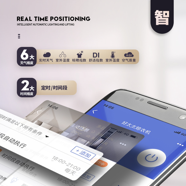 根據定位的實時環境信息,按照設定的時間或天氣條件,實現智能自動開啟照明、升降。